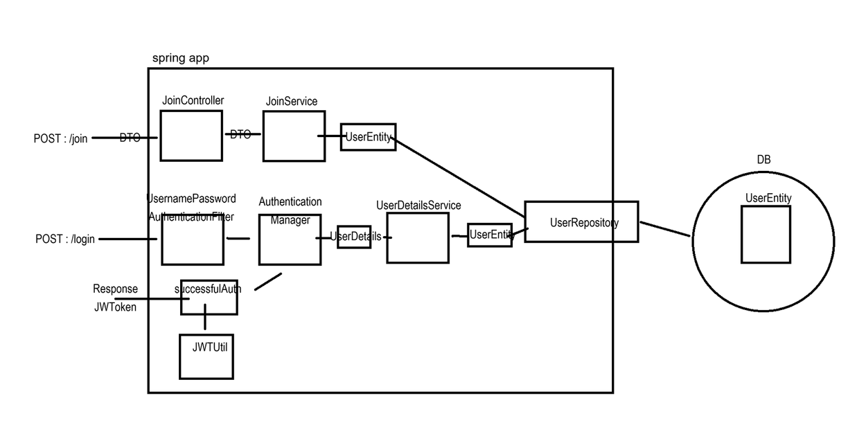 UserPasswordAuthenticationFilter : 회원검증 AuthenticationManager : 아이디와 비밀번호이용해 검증 -> DB연결 (userDetails)이용 userDetails userDetailsService UserEntity UserRepository